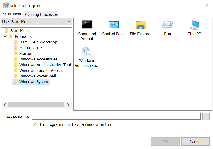 This window or similar is used in several places throughout the program, such as selecting a program specific scope, using the Terminate Process command, the Program Launch command and others that require selecting a program.