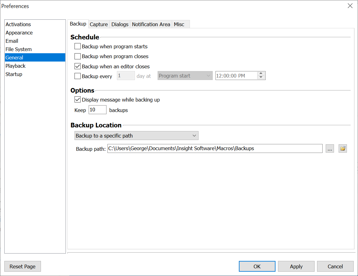 Use this option to create automatic backups of the macro data file currently in use. This option allows for selecting the frequency of the backups, the number of backups to store and where to save the backup files.