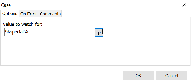 The Case command may contain a variable or it may contain a value that is entered directly in the Case command. For example, use a value of %T[2]% or enter a text string such as "Done".