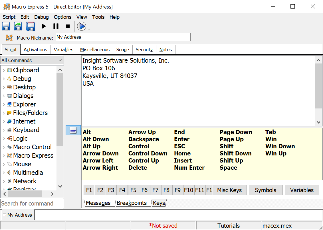 4.Open the Macro Explorer window to see the newly defined macro, My Address, added to the list of available macros.