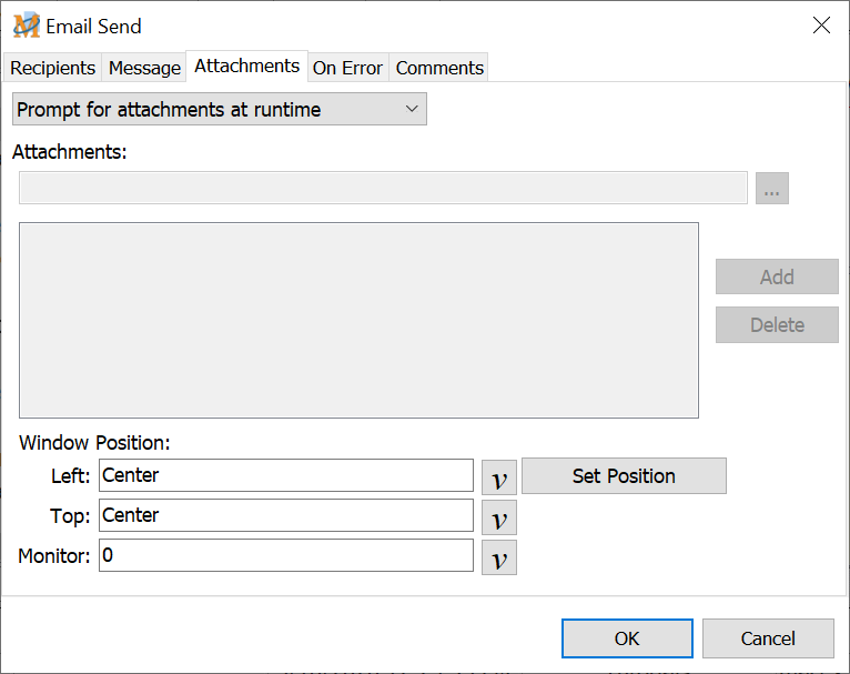 Use this option to select the email attachment during macro design time. Click on the Browse button to locate and select the attachment file. Then click on the Add button to add to the list of attachments. Variables may also be used as part of the attachment file name.