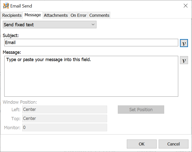 The fixed text option sends the same fixed text email message each time the macro is invoked. Enter the message subject in the appropriate field and the email message into the Message edit box.