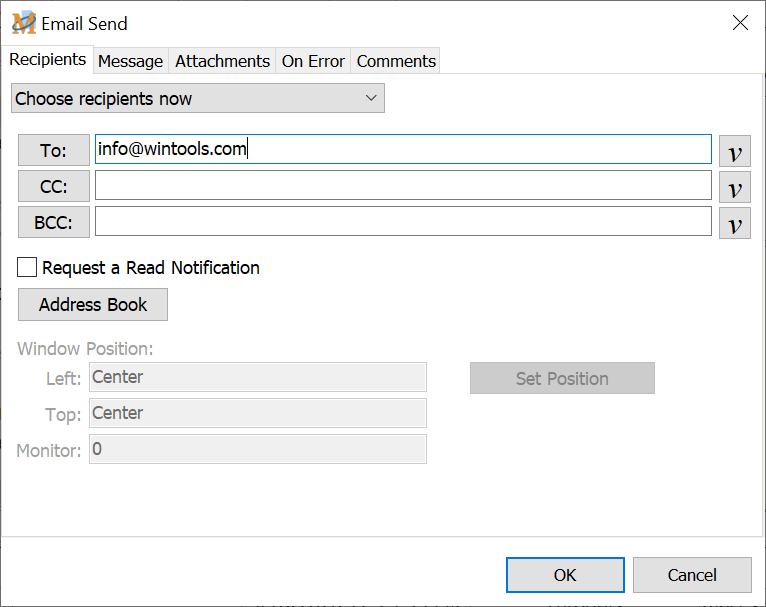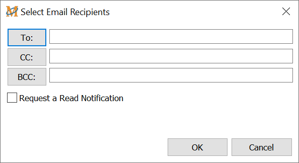 The Prompt for recipients at runtime option displays a window similar to the one shown below during playback of the macro. Enter the email address or addresses of those to receive the email in the appropriate fields. Or click on the To, CC or BCC buttons to insert an address from the Address Book.