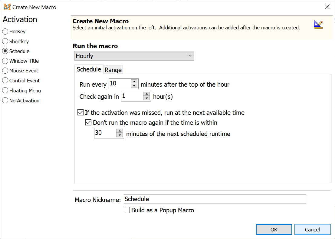 If the scheduled activation was missed, it may not be desirable to run the macro twice within a short period of time, such as 12:40 and 1:00. Insert a value such as 30 in this field. For example, if the computer restarts at 12:40, the macro does not run because the time is within 30 minutes of the next scheduled macro at 1:00.