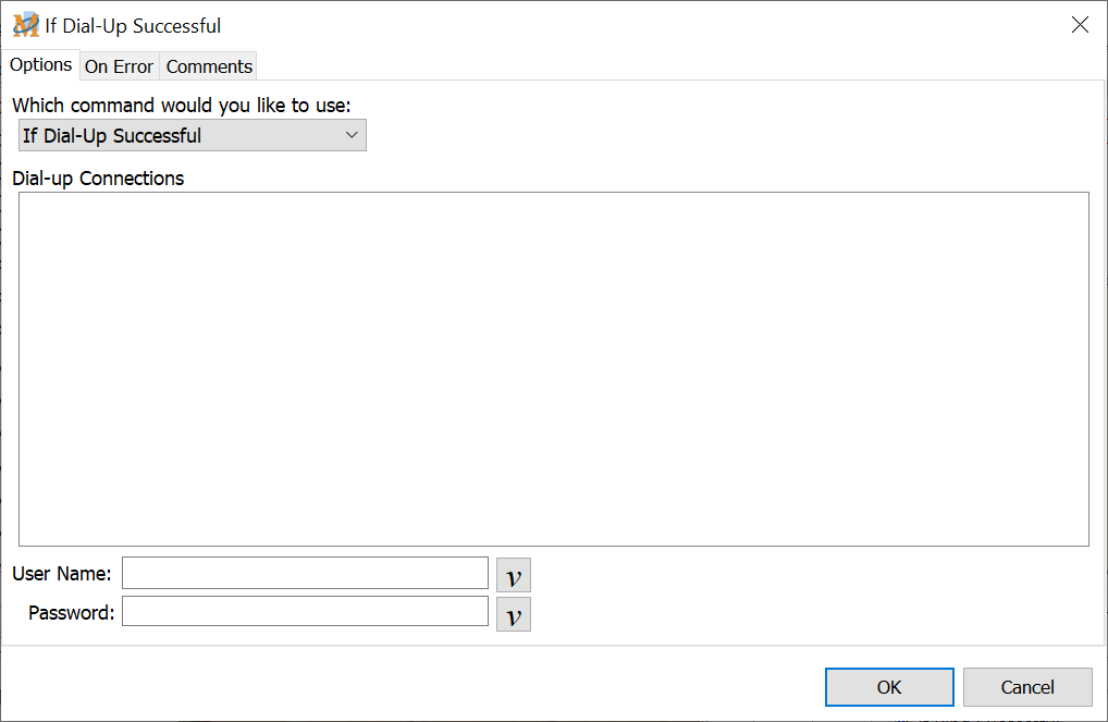 The If Dial-up Successful feature tests if a dial-up networking attempt was successful or not. All commands following this statement until an ENDIF or ELSE command is reached are executed if the dial-up connection is successful. If the dial-up fails and an ELSE command is used, then all commands following the ELSE until an ENDIF is reached will be executed. By placing this inside a "Repeat Until" loop, this command will repeatedly attempt to dial until a successful connection is made.