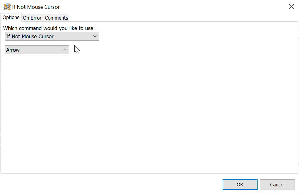 This command is essentially the opposite of the If Mouse Cursor command. It checks the status of the mouse cursor, but takes action based on whether the status of the mouse cursor does not match the selection chosen. Choose from twenty one different mouse cursor options.