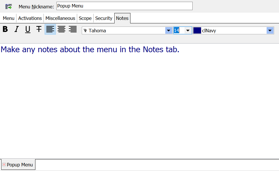 This tab opens the Notes field. This is a free form text editor for keeping notes about the macro. Use this option to make some notes about the menu, how it is to be used or how frequently. Essentially this field can be used to input any pertinent information about the menu.