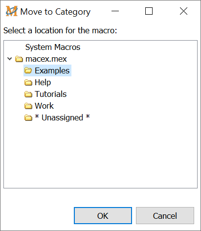 Use this menu command to assign macros to categories already created. Highlight the macro to be assigned and click on Macros > Move to Category to display a list of categories such as in the example below. Highlight the category to move the macro into and press the OK button. The macro is now assigned to the category selected.