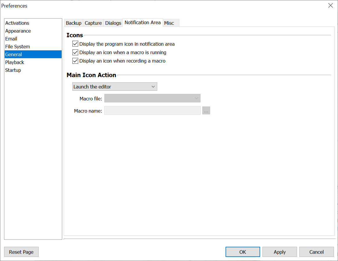 Macro Express Explorer > Options > Preferences > General > Notification Area