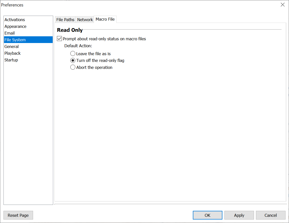 üNote: If using the Load New Macro File command and the file to be loaded is a Read Only file, then the Default Action selected in this Preference panel will be used.