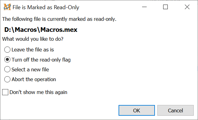 Select this option to have the program prompt for action when a read only .mex macro file is encountered. The following dialog opens allowing the user to select a course of action.