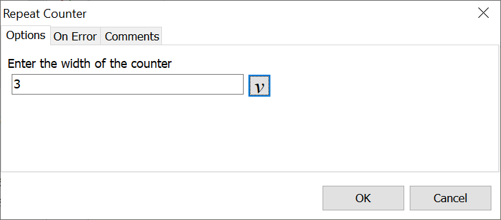 If leading zeros are desired on counter values, then specify the "Counter Width". For example, to ensure that all values are at least 3 characters long, enter 3 for the width. This produces 001, 002, etc.