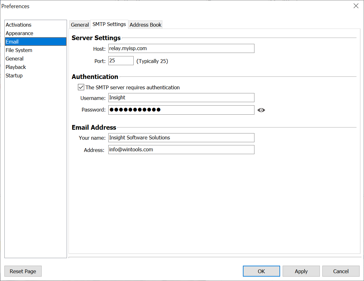 The email provider may require use of SMTP Server Authentication. If so, select this option and insert the user name and password in the appropriate fields. If authentication is not required, then leave this option unchecked.