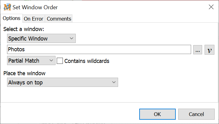 Select this option if a wildcard is included in the window title name. A wildcard uses the " * " or " ? " characters in the title to expand the possibilities of a match. These are similar to the wildcards used in Windows for searches.