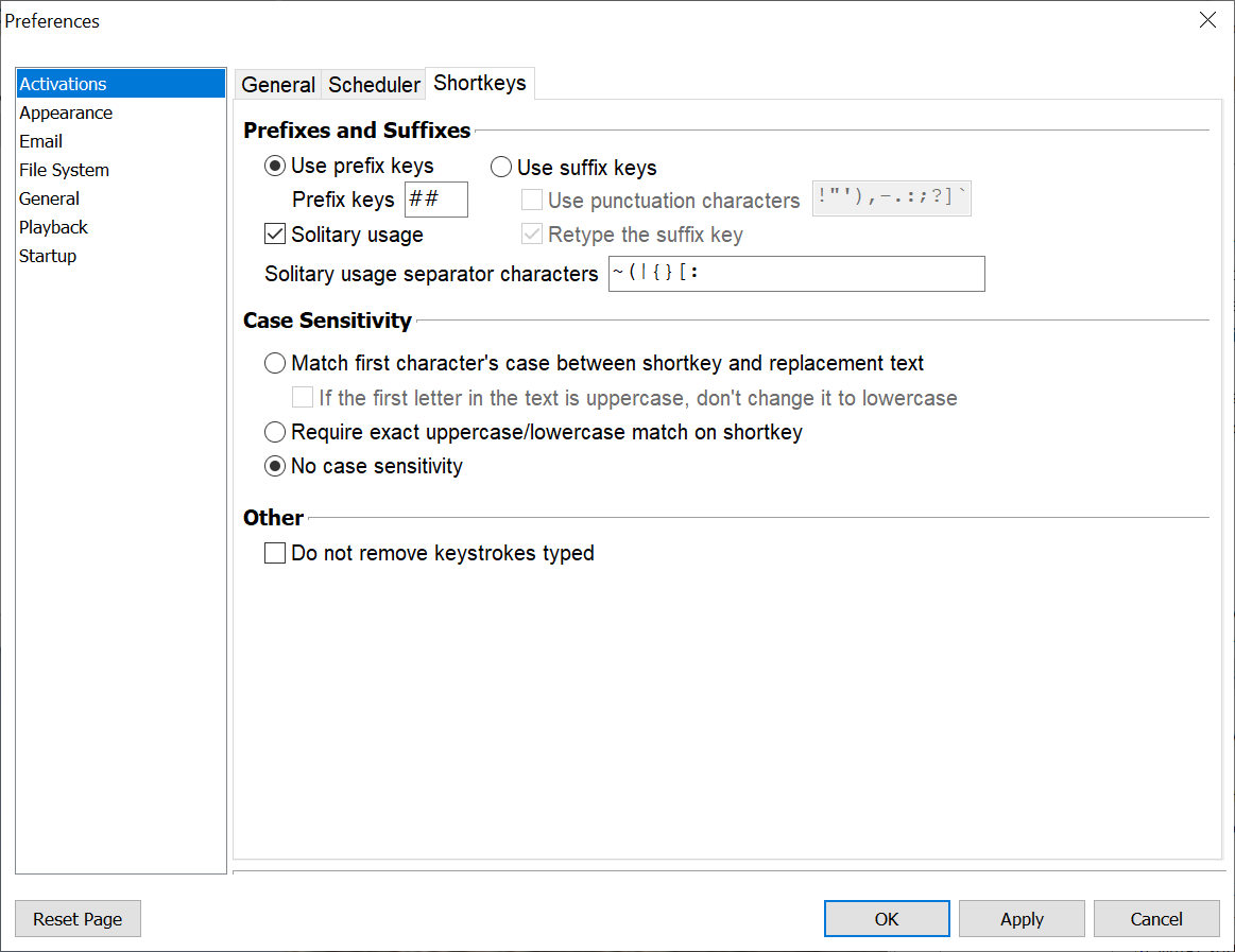 A shortkey is a set of characters such as abc, myname, etc. The macro runs when the characters are typed into an application. Click on Options > Preferences > Activations and the Shortkeys tab to define the settings. Below are descriptions of the default settings that can be assigned to all shortkeys.