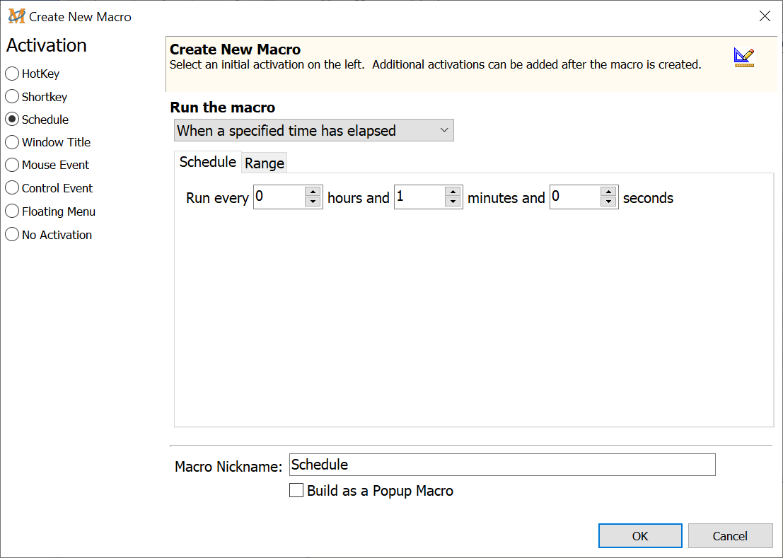 The When a Specified Time has Elapsed option repetitively runs a macro every XX number of hours, minutes and/or seconds.
