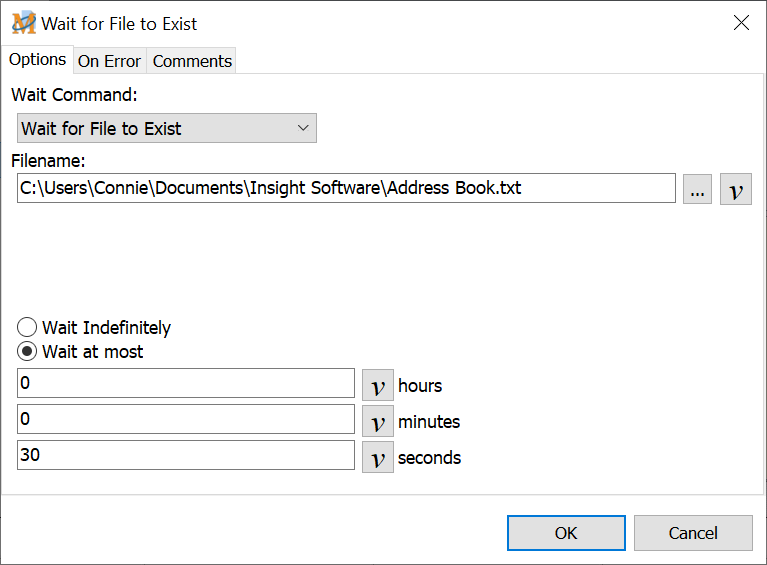 This option waits for a specific file to exist. As an example, a macro creates a new file and then uses the Wait for File to Exist command to instruct the macro to wait until the file has been created before continuing.