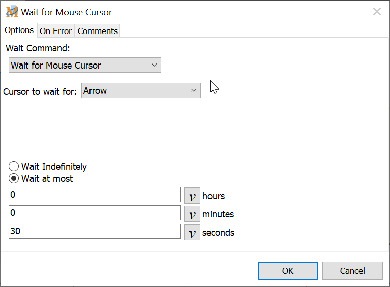 This option instructs the macro to wait until the mouse cursor type selected appears on the screen. When the specific mouse cursor type appears on the screen, the macro continues.
