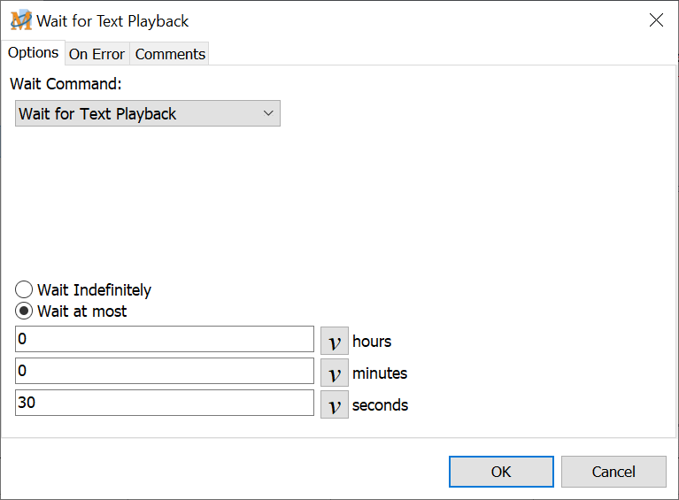 This option is to be used immediately after a Text command, such as the Text Type function. Wait for Text Playback prevents the macro from continuing until all of the text has finished playing back.