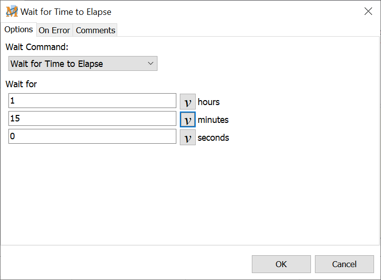The Wait for Time to Elapse function instructs the macro to wait a specified number of minutes and seconds before continuing. This command is similar to the Delay command, but with a couple of noticeable differences. First, it allows for a much longer wait period (up to about 7 days). And perhaps more important, this command puts Macro Express into a wait state where virtually no CPU cycles are used, thus allowing CPU intensive programs to continue uninhibited.
