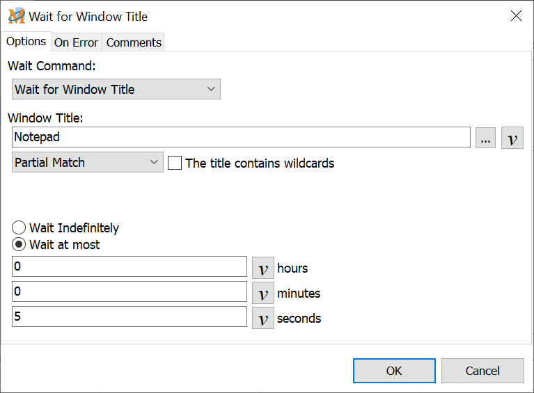The Partial Match option does not require an exact window title match. For example, if waiting for a notepad window, inserting "notepad" or "notep" as the window title will find the window. This is particularly useful as some Window Titles change based on whether a given file is open. Case sensitivity is not required. For example, "NOTepad" will work as well as "notepad".