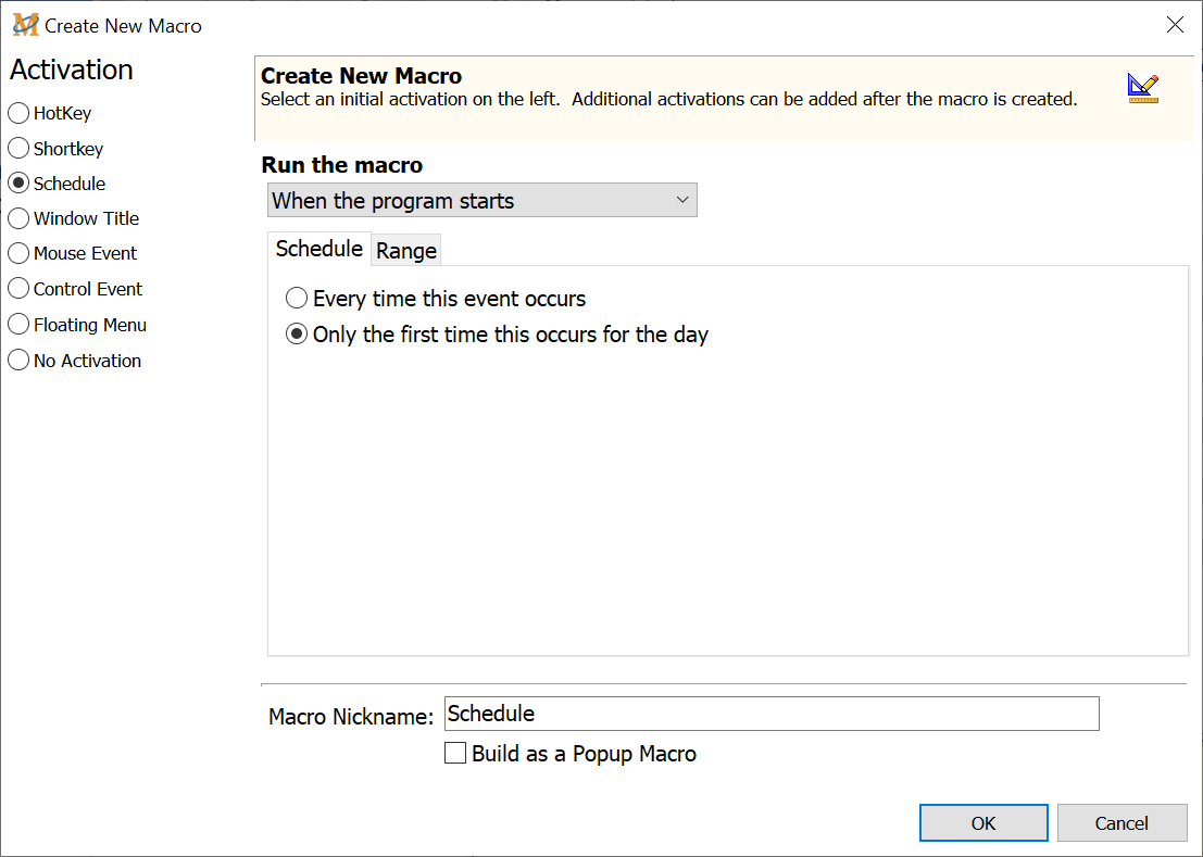 This option plays back the scheduled macro the first time Macro Express is started for the day. If the program is restarted, the macro does not play back.