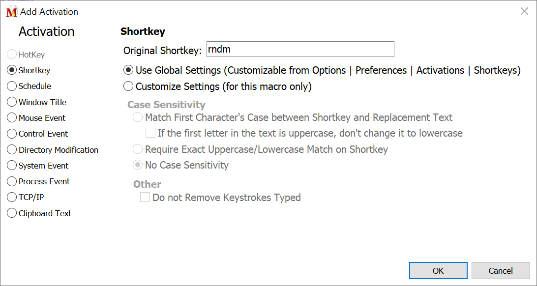 Click on the Add button to open the Add Activation window, as shown below. Use this window to add a second or third activation type to your macro.