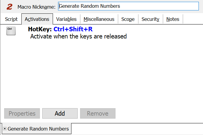 To view the Properties, highlight an activation listed and click on the Properties button. This opens an edit field where changes may be made to the activation selected. For example if the activation is a hot key of Ctrl+Shift+R, assign the activation to another combination.