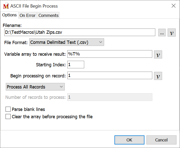 ASCII File Begin Process: C:\Insight Software\Utah ZIPS.csv Text Type (Simulate Keystrokes): %T[1]% %T[2]% %T[4]% %T[5]% %T[6]% %T[7]%