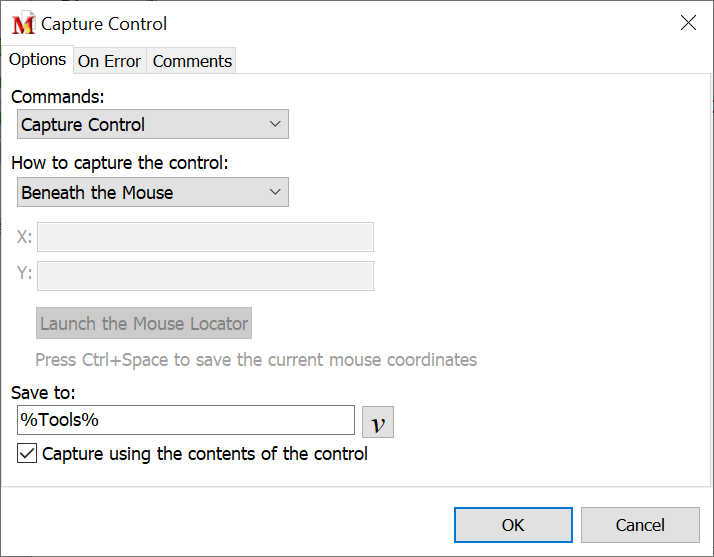 During playback of the macro, this command determines the location of the mouse cursor. The control located beneath the mouse cursor is captured and saved to the variable in the "Save to" field.