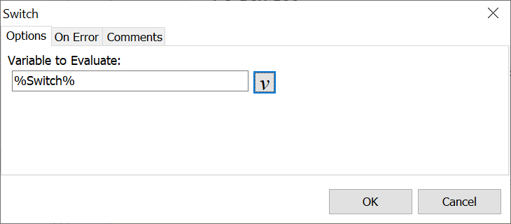 The Switch command requires a variable. This may include any type of variable, such as Integer, Text or Decimal. But all values in the Case statements that follow must be consistent with the type of variable chosen for the Switch statement. If the values are not consistent, the results may be unpredictable.