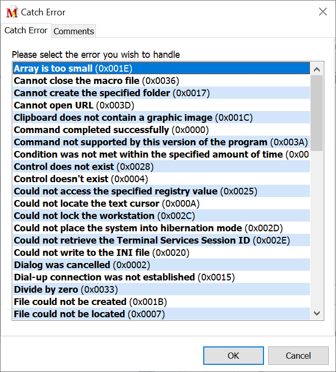 Cannot close the macro file Cannot create the specified folder CD command could not be executed Clipboard does not contain a graphic image Command completed successfully Condition was not met within the specified amount of time Control doesn't exist Could not access the specified registry value Could not locate the text cursor Could not lock the workstation Could not place the system into hibernation mode Could not retrieve the Terminal Services Session ID Could not write to the INI file Dialog was cancelled Dial-up connection was not established Divide by Zero File could not be created File could not be located File could not be opened File format is unsupported File is not the correct format Files required for Dial-Up Networking are not installed Invalid Date/Time value Invalid Input Label does not exist Macro does not exist Macro file is already loaded Macro is locked by another user Macro was halted Maximum is smaller than the minimum Message could not be sent Network error Notification area icon does not exist Operation was not completed Path does not exist Process could not be terminated Process is not running Program could not be launched Registry key cannot be created Registry key cannot be deleted Registry value does not match the variable type Requested feature is not supported Resolution is unsupported SMTP connection failed Specified date/time is not supported by the file system Specified printer does not exist Text being waited for is too long There are currently no IP addresses assigned to this computer There are no Internet Explorer windows to watch There is no control to capture Unable to access clipboard Undefined Variable Window could not be found