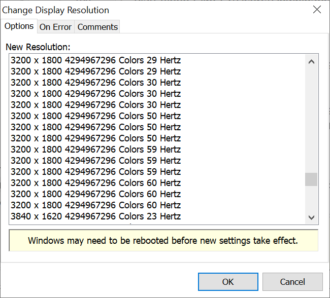 üNote: Depending on the video driver, it may be necessary to reboot the computer before the new screen resolution settings take effect. If this is the case with the system, place a Reboot command in macro - after the screen setting command. This changes the screen resolution and then reboots the computer to initiate the settings.