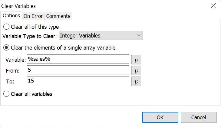 If using an array variable in a macro, this option clears a range of array elements for the variable selected.