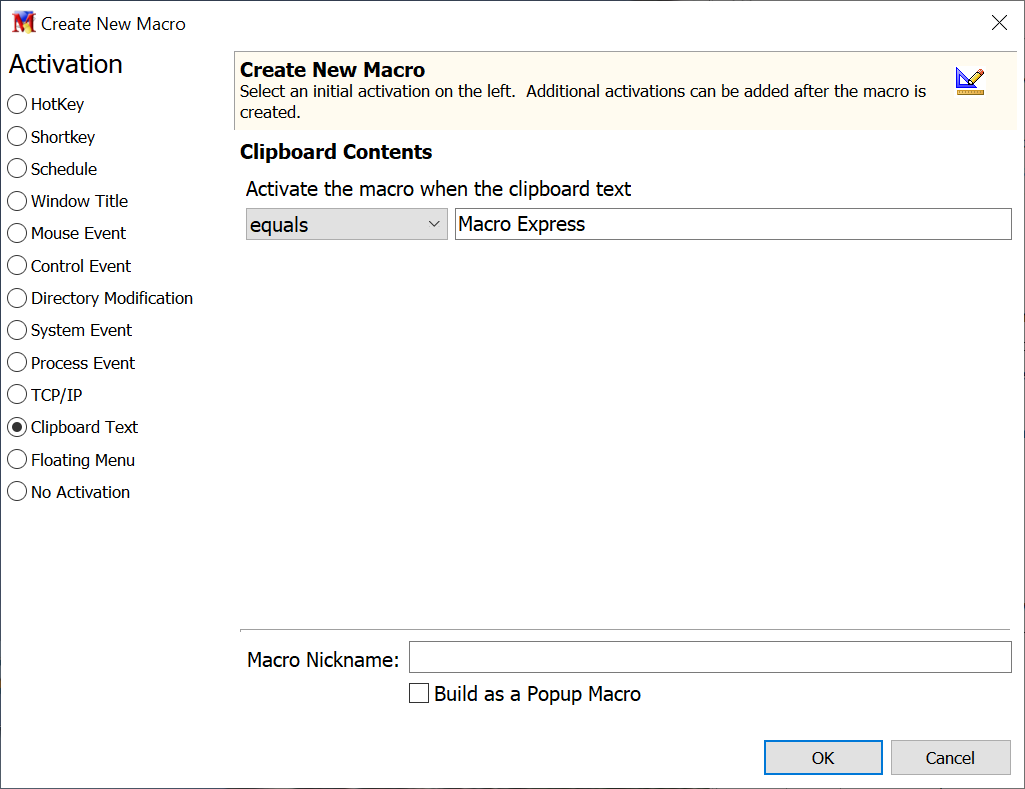 The macro starts if the activate option is changed to Does not Equal and text other than Macro Express is copied to the clipboard.