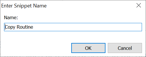 A small dialog box opens prompting to name the snippet. The name helps to later identify what the snippet does. Click OK to save the name and add it to the list of existing snippets.