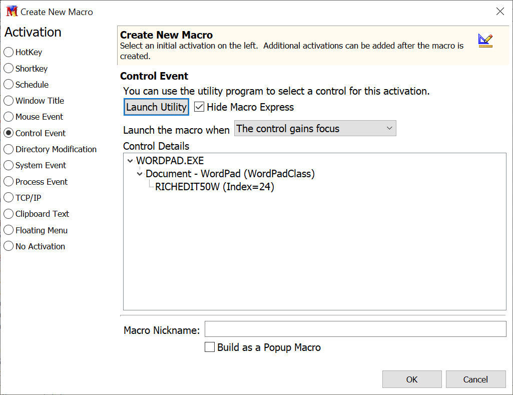 With Control Activation selected, the macro plays back when the control gains focus or the window with the control gains focus. In the example above the control name is listed. The program .exe is displayed followed by the window component that must be active in order for the macro to play back.