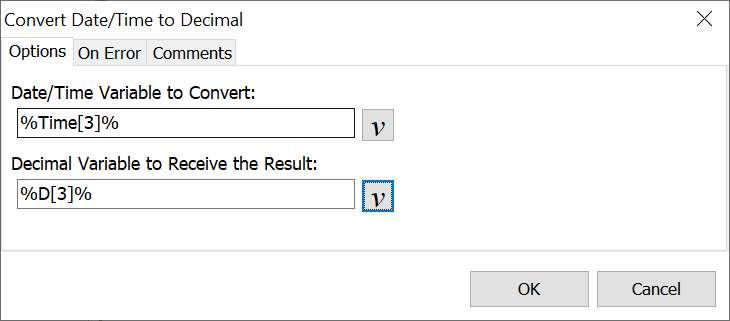 This option converts a Date/Time variable to a decimal value representing the date/time. The value is then saved to a Decimal variable. Create a Date/Time variable through the Variable tab in the Script Editor or through the Date/Time command.