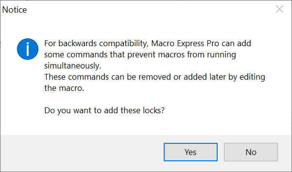 1. Macro Express Pro allows more than one macro to run simultaneously. When importing or opening a v3 macro file in Macro Express Pro, you will see the message displayed below. Answer Yes to place a File Lock command in each of the macros being converted. This prevents the macro from playing while another macro is already running.