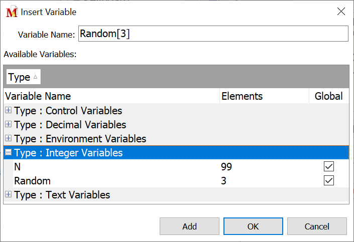 Click on the Variables button to open the Insert Variables window and choose a variable to play back in a macro. Select the variable from the variable types available and click on the OK button. This places the variable into the Macro Text at the location where the cursor is positioned. Or click on the Add button to name a new variable to use in the macro.