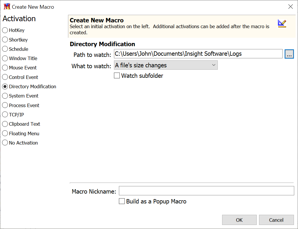This activation type looks for changes to files in a folder or to the folder. A macro starts when a change is made to a file in the selected folder or to the folder itself. Some of the available options include the macro looking for changes to file size, attributes, write time, security descriptor or checking if a file has been renamed or deleted.