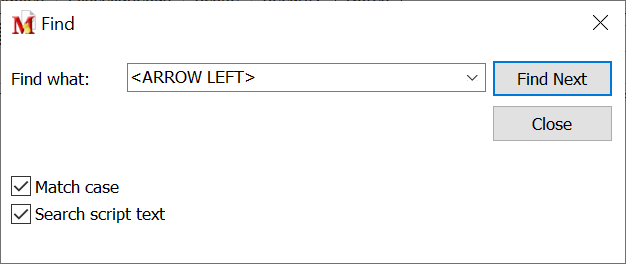 Use the Find command to locate a key word in the text of the macro being modified. Click on Edit > Find or Ctrl F to activate the Find window as shown below. Type in the word or phrase to find and click the Find Next button or press Enter. The search scans the macro for a potential match. If one is found, the first item located is highlighted. If no match is found, a message displays indicating that no match was found.