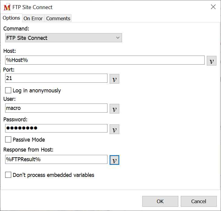 When using a variable in any of the fields of this command, the Don't process embedded variables option ignores all % signs found within the variable value and does not attempt to treat the % signs as an embedded variable. It will just expand the % sign as a standard character during macro runtime.