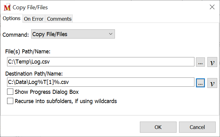 This allows action to be taken on any folder found within the folder selected, if that folder matches the wildcard. For example, if using *.*, a match occurs on every folder name. If the command is to copy *.* and this option is selected, then all subfolders and their contents will be copied as well.
