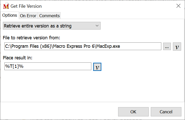This command obtains the file version number of the file selected and saves the information to a text string variable or integer variable. This can be useful in comparing two program files to determine which is the later file. Use this command primarily with executable (.exe) files, .dll files, and similar, as these files normally contain version number information.