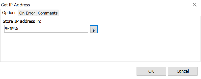 The Get IP Address command finds the IP (Internet Protocol) address of the computer running the macro and saves this address to a variable. This command may also help in determining if an online connection is active or not.