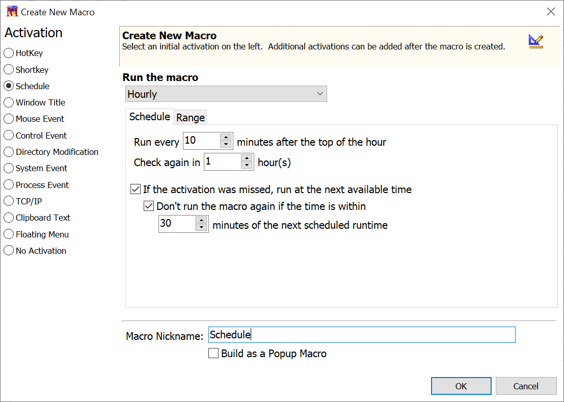 If the scheduled activation was missed, it may not be desirable to run the macro twice within a short period of time, such as 12:40 and 1:00. Insert a value such as 30 in this field. For example, if the computer restarts at 12:40, the macro does not run because the time is within 30 minutes of the next scheduled macro at 1:00.
