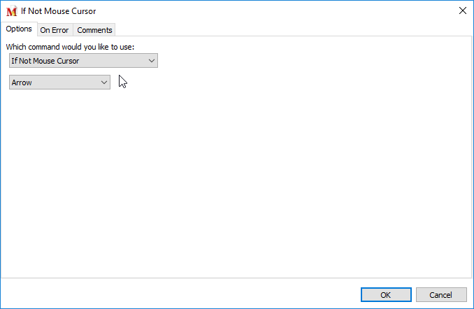 This command is essentially the opposite of the If Mouse Cursor command. It checks the status of the mouse cursor, but takes action based on whether the status of the mouse cursor does not match the selection chosen. Choose from twenty one different mouse cursor options.