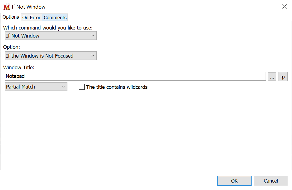An exact window title match is not required. For example, insert "notepad" or "notep" as the window title and either would be recognized by the If statement. This is particularly useful as some Window Titles change based on whether a given file is open. Case sensitivity is not required. For example, "NOTepad" will work as well as "notepad".