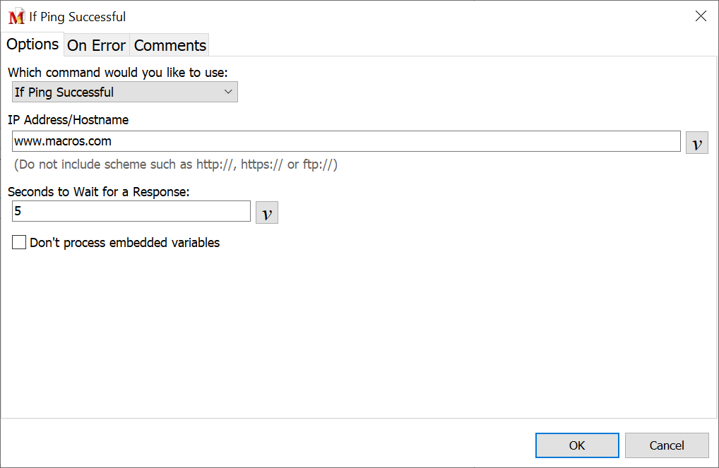 Insert the IP Address or website to ping. Do not include modifiers such as http:// or ftp://. If pinging our Macro Express website, insert www.macros.com.